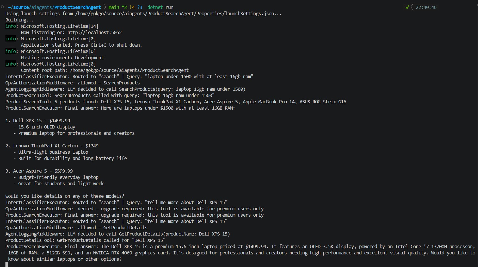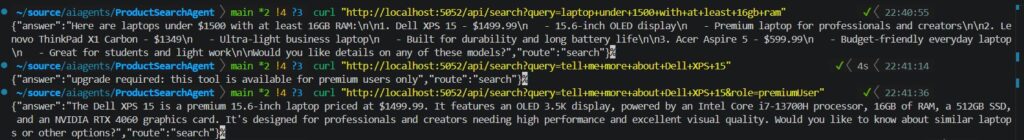 Now it’s time to bring OPA into our sample AI workflow. The scenario we are going to build is simple. Our current agent already supports product search and now we want to add a second capability that lets users retrieve full product details. But that feature is going to be reserved for premium users. Standard users can search as much as they want but only premium users can ask follow up questions like “tell me more about this product.”